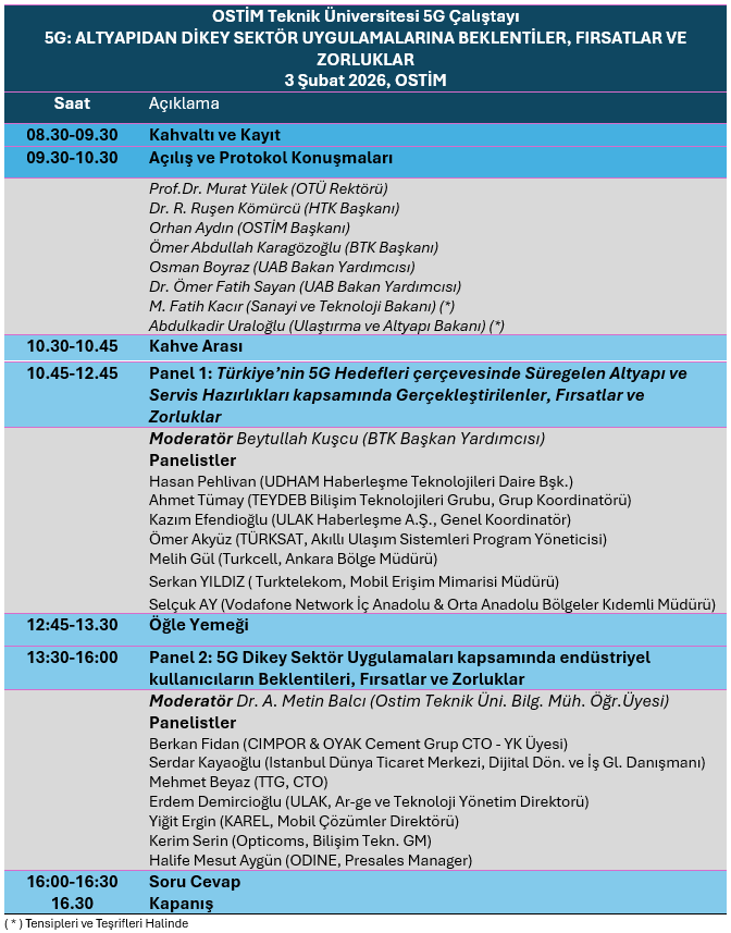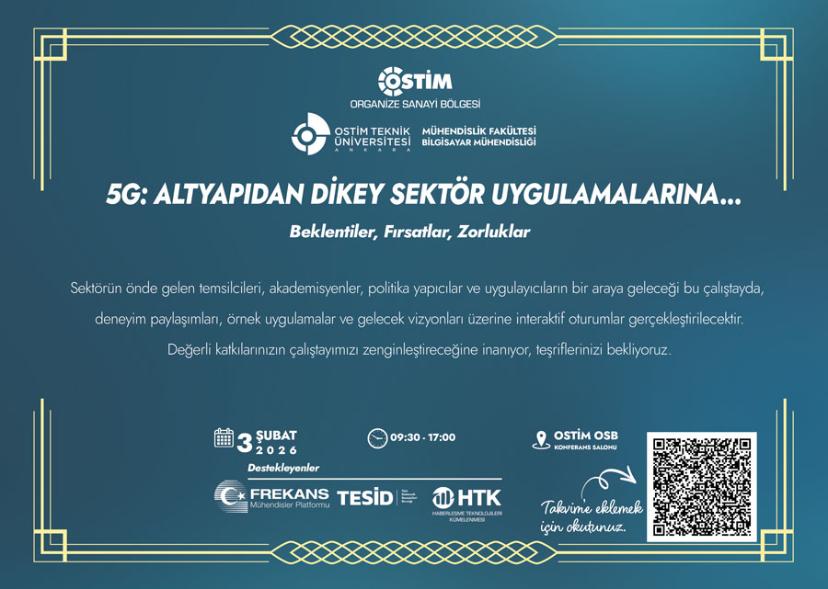 Under the coordination of OSTİM Teknik Üniversitesi—which strives to effectively connect technological advancements with industry and manufacturing—and hosted by OSTİM Organize Sanayi Bölgesi, with the support of Haberleşme Teknolojileri Kümelenmesi (HTK), TESİD, and the Frekans Mühendisler Platformu, we are planning to hold a workshop titled “5G: From Infrastructure to Vertical Sector Applications; Expectations, Opportunities, Challenges” on Tuesday, 3 February 2026.